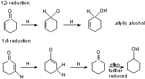 - LAH and NaBH4 give mostly sat'd alcohol (1,4) - DlBAH and 9-BBN give exclusive 1,2 (C=O reduction) - H2/cat often reduces only C=C b) NaBH4 will reduce ketones in the presence of esters, amides, C=C, nitro, R-X.