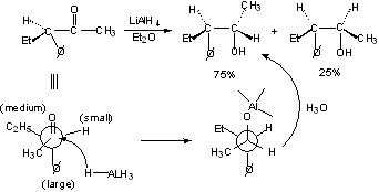 For other examples: See Scheme 5.5 (p. 245) "Reduction of Other Functional Groups by Hydride Donors" See Scheme 5.6 (p. 251) for other R3SnH reductions. Stereochemistry of Ketone Reductions Rule of Steric Control of Asymmetric Induction - Cram's Rule Ketone will react preferentially in the conformation in which the carbonyl group is staggered between the medium and smallest substituents on the a-carbon.
