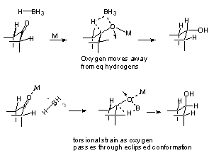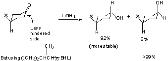 Table 5.3 Shows reduction of substituted cyclohexanone mediated by steric approach control. But if product development control does not function, then how do we explain the preference for equatorial alcohols where no over-riding steric factors exist?? Perhaps due to extra torsional strain in the transition state leading to axial alcohols.