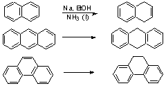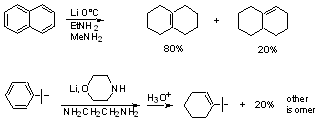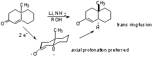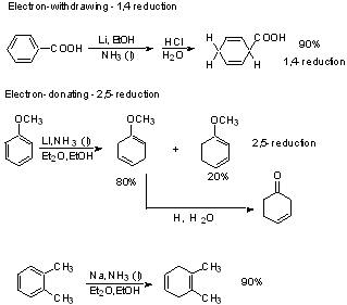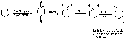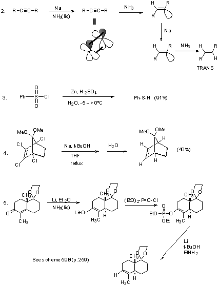 In general, we use this method to reduce conjugated systems, enones, or aromatics. For saturated C=O compounds, hydride reductions are better. Reaction Conditions 1) Metals commonly used: lithium sodium potassium (cesium) (calcium) zinc magnesium tin iron 2) Solvents NH3 (b.p. - 33˚) for alkali metals (and Calcium); "Birch Reduction" low molecular wt. amines hexamethylphosphoramide (HMPA) ether, THF, dimethoxyethane (DME) -- dilute solns. crown ether complexes ether, toluene, xylene -- suspensions 3) Proton Source ethanol -- Present in reaction medium isopropanol -- added with compound to be reduced t-BuOH -- added during isolation. H20 4) Amalgams with Hg (Free metal and HgCl2) Aluminum Zinc Tin Stereochemistry