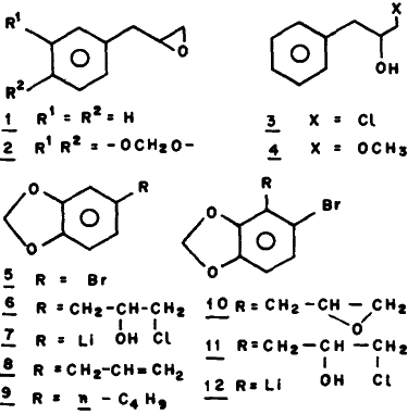 Bromocompound (5) was prepared10 from 1,3-benzodioxole and its purity checked through glc. n-hexane solution of n-butyllithium (2.95 N, 2.24 ml) was added to a solution of 5 (1.36 g) in tetrahydrofuran (20 ml) at -78°C. After 5 min epichlorohydrin (0.60 g) was added. The reaction mixture was kept at -78°C for 30 min and the temperature allowed to rise to -10°C. A solution of NaOH (1.6g) in water (16 ml) was added and the reaction mixture stirred at room temperature for 1h. The product isolated after usual work-up was separated into three main fractions through preparative TLC on silica gel. The TLC plates were developed with 85:15 mixture of pet. ether-acetone.