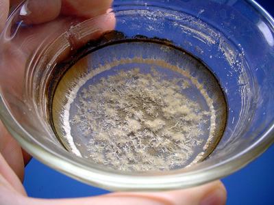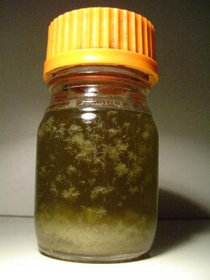 Once every hint of solvent has been evaporated out and the extract is completely dry of moisture pour in four or more ounces of pure Naphtha directly into the evaporation container (or if having already scraped it out of a large evaporation container transfer all of the extract into a smaller container so that you can work with it better). Completely dissolve all clumps of extract or wax into the Naphtha so that only fine granules remain in the fluid. Next, pour all of the Naphtha and every bit of the extract into a pint sized or smaller glass jar, setting it aside undisturbed for an hour or more. What your waiting for is for the ultra-fine salvinorin particles that are stirred up in the Naphtha to settle to the bottom of the glass which can take as much a hour or more for most of them to fall out of the fluid, this works with Naphtha because salvinorin is insoluble to this solvent. After waiting for the salvinorin particles to settle then slowly, taking great care not to let any of the particles flow out with the fluid pour off the dark green Naphtha leaving the crude salvinorin extract in the bottom of the glass. Next add more clean Naphtha to the jar and mix the extract into the fluid for five minutes and set aside for another hour or more before pouring off the Naphtha again. Continue using Naphtha to remove Chlorophyll waxes from the extract until the fluid becomes a light translucent green color, at this point it has become ineffective for removing additional Chlorophyll. When done completely pour off every last drop of Naphtha and completely dry the extract so that no hint of Naphtha remains.