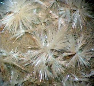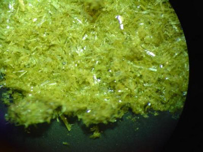 The following two pictures are of some very nice white salvinorin crystals which formed through slow evaporation of Acetone at room temperature. These crystals were produce by adding white salvinorin powder into a small bowl full of Acetone warmed to a temperature of about 130°F. then stirring in as much salvinorin-A powder that could be dissolved into it and setting it aside for a week. When I came back I found these crystals. Sometimes crystals will grow, other times none will form at all. The second picture was taken close up using a zoom stereoscope set to 45X magnification. The light brown colored material at the base of the crystals is tannin sediment that was not removed from the salvinorin powder like I should have done by mixing water into the extract to dissolve any remaining tannin contaminate into it and then pouring the water off to remove it. Of course dried before adding to the hot Acetone.