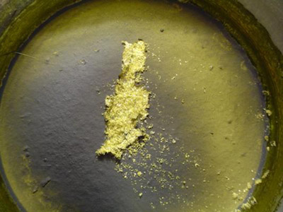 After it's obvious that Naphtha has become ineffective removing additional Chlorophyll and unable to take on more color with each additional wash of the extract, pour off all of the Naphtha and completely dry the extract of any hint of Naphtha. Next, pour in an ounce or more of water into your container of extract and stir for a couple of minutes, allow time for the particles to settle to the bottom of the glass and pour the water off, adding more water to the extract and stirring again. If tannin is present in the extract the water will become a yellow to brown tint, but if using a cup or more of water at a time small amounts of tannin being dissolved out of the extract might be so diluted by that large of an amount of water to be unable to see any change of color to know if its being removed, because of this I like to work with only an ounce of water at a time to be able to know when all of the tannin has been completely removed and I can stop washing with water. Once your done removing tannin with water completely dry the extract of all moisture and place all of the dried extract into a small two inch diameter spice bowl, or even a small shot glass or something of similar size. Next, pour in enough fresh Naphtha into the glass of extract so that there is about a half inch of Naphtha on top of the extract and briskly stir for about a minute with a spoon, then place the glass or bowl into an electric oven set to about 120°F. with its door cracked open a couple of inches and evaporate all of the Naphtha out of the glass. Keep the small container of Naphtha as far away from the heating elements as possible because there is potential for fire. When using this technique by leaving the glass or bowl completely undisturbed in a warm oven while the Naphtha is evaporating off the extract, the heavier salvinorin crystals will all fall to the bottom of the glass while the lighter Chlorophyll impurity forms an upper crust on top. Once all of the Naphtha has been completely evaporated out of your extract you can freeze the glass to cause the top layer of wax to stiffen up enough to be able to easily peel the crust off of the top to expose nothing but golden colored to light green high purity sand-like salvinorin crystals in the bottom of your glass. They might not seem like crystals unless seen under magnification, but they are.