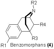 Brief mention will be made of a simpler, tricyclic, family of morphine substitutes, the benzomorphans (4). These chemicals were initially explored by May and Murphy18 and appear to represent the clinically desirable features of analgesia without the usual accompanying dependence liability or undesirable side effects19. And as it is just these latter two properties that would be needed for satisfactory heroin replacement, the possibilities of abuse is considerably less. As With morphinans, it is again through variations of the N-substituent that the widest expression of potency and effectiveness has been achieved. One of these derivatives [4, R1 = OH, R2 = dimethylallyl, R3 = R4 = CH3, pentazocine, Talwin] has achieved wide clinical utility as an analgesic, and in fact its apparent freedom from abuse liability20 allowed it to be marketed without any of the controls associated with narcotics. However, there is a growing body of literature to indicate that there is an abuse potential associated with the drug21. Although the dependence-producing potential has been vigorously attacked22 there are reports of clear hallucinogenesis associated with its use23. A similar analgesic, Cyclazocine, has an N-cyclopropylmethyl group, and has reported sideeffects of confusion and euphoria24.