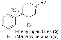 Meperidine [5, R1 = H, R2 = CH3, R3 = CO2C2H5, R4 = H] is a broadly used clinical drug with clear morphine-like properties, which serves to define this family. It was first prepared25 in a search for atropine substitutes. Its potency is somewhat less than that of morphine26, but it maintains the dependency liability acid several other. of the clinically undesirable properties of morphine. As noted in both morphinan and the benzomorphan families above, it is through modification of the substituent on the nitrogen that a broad expansion of potency has been noted in the meperidine group. An excellent structure-activity relationship study of these compounds has been prepared6, with some potencies many thousands that of morphine having been reported. Meperidine itself has been shown to be cross-tolerant with heroin both physiologically and psychologically27 and there is no reason not to expect its more potent but uncontrolled analogs to be similar. A quotation from a recent textbook is timely28: