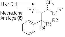 The simplest morphine imitations that can be seriously considered as potential heroin substitutes are the monocyclic analogs, in which even the piperidine ring is opened. This is most conveniently referred to as the "methadone" family. This chemical group was apparently first uncovered by Bockmuhl in Germany during World War II31 in efforts to find pharmacologic substitutes for morphine. The most direct syntheses of methadone (and the procedures that are most likely to be employed by illicit chemists) involve diphenylacetonitrile32,33 and lead to a mixture of the desired product [methadone and isomethadone, isomers with the methyl group located in one or the other of the two, indicated positions in 6]. Both isomers are active as morphine-like pharmaceutical agents, although the alpha-methyl compound has been accepted as being of a higher therapeutic safety value. Illicit methadone production as a heroin substitute is apt to be found as a mixture, as the separation is troublesome, and the two isomers are not grossly different pharmacologically. A variation of the isomethadone (7) structure, with reversed ester structure at R3 [6, R3 = OCOC2H5, and R4 = CH2C6H5) is the analgesic propoxyphene (Darvon). It is not under narcotics control, and has not yet shown appreciable abuse potential. Although little exploratory work has been done modifying the structure of methadone, three areas of chemical and clinical interest are noteworthy. One, the reduction of the ketonic carbonyl group to a carbinol group and the corresponding acetylation of it leads to the acetylmethadol group of compounds, which seem to be of comparable activity, but with slower onset of action, and of longer duration34. This compound is now being explored quite widely in substitution for methadone in the area of methadone maintenance and methadone withdrawal in heroin recovery clinics35. No chemical extrapolation of this promising lead has been reported.
