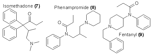A third area of morphine-like activity has been found with substitution upon the nitrogen atom of methadone. A series of 4,4-gemdisubstituted piperidinyl analogs have been found6 to be some 1500 times as potent as methadone, and to be quite a bit longer acting. There are no studies of these chemicals in humans, but there is certainly represented here a rich area of potential chemical exploration. An outgrowth of this line of exploration is the development and clinical evaluation of morphine-like analgesics such as Fentanyl (9) (active in humans as a narcotic at about 25 µg intravenously) and its isopropylamine analog, which is about twice as active. The exquisite reasoning that has produced this logical development of drugs is apparent from the comparison of their structures below: