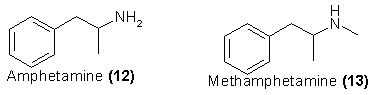 The best defined and most extensively studied examples of this form of central stimulants are chemicals commonly referred to as amphetamines. The use of the plural term "amphetamines" is widespread, but it is ambiguous. The term "amphetamine" is a single specific compound, 1-phenyl-2-aminopropane (12) and the most restricted use of the term "amphetamines" applies to this chemical, either of its optical isomers, and generally the N-methyl homolog methamphetamine (13) and its isomers. A more general use has come into both legal and medical literature that considers that larger family that shares the common chemical carbon skeleton of the amphetamine molecule and that can in the pharmacologic sense serve as a substitute. A third usage, found in phrases such as "hallucinogenic amphetamines," refers to compounds exhibiting the basic carbon skeleton of the amphetamine molecule, but that are so separate in their pharmacologic expression that they can in no way be considered stimulants. They are discussed in the Hallucinogen section below.