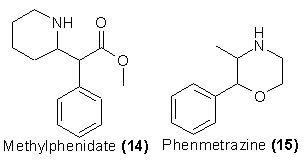 The original amphetamine stimulants, amphetamine and methamphetamine, have been displaced by a number of chemically related drugs that have the phenylisopropylamine skeleton and that appear to varying extents to duplicate the action of amphetamine. Rather than establishing a class regulation (as has been done in Great Britain with the Drugs Act, 196445), the procedure followed has been to treat each drug individually and to move it from uncontrolled, to prescriptional availability, to appropriate scheduling in the Controlled Drugs structure as abuse reality became apparent. Thus amphetamine, used clinically since 193546, and methamphetamine received extraordinarily broad abuse both in the United States and abroad after World War II; they are now Schedule II drugs. Of the many substitutes for amphetamine that were prepared and evaluated in the post-war era, both methylphenidate [Ritalin, 14] and phenmetrazine [Preludin, 15] have been documented with sufficient misuse to warrant scheduling (to Schedule II, November 1971). As was mentioned in the substituted piperidine portion in the narcotics section, the concept of the reversed ester (the replacement of a [-COOR] group with the isometric [-OCOR] group with a retention of pharmacologic style of activity) also applies to the Ritalin molecule.