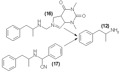 A second type of abuse drug is suggested by the structure of the material Aponeuron [AN-1, 17], which is prepared by the coalescence of amphetamine, benezaldehyde, and cyanide, and which apparently releases the contained amphetamine following introduction into the body49,50. These chemical extensions are probably documentable in their abuse only through the appearance of amphetamine in analyzed urine samples. It will be of scientific as well as social interest to see if similar chemical manipulations (the conversion of a recognized and scheduled drug into a legally innocuous analog which will regenerate the original drug in vivo) might be extended to include the many structurally similar stimulants and hallucinogens.