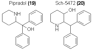 Another class of mild central stimulants that are reportedly without tolerance-building capabilities or antidepressant properties are compounds based upon the structure of Pipradrol (diphenyl-2-piperadylcarbinol, 19).