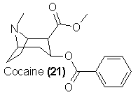 This is not true in the case of another well-known stimulant, cocaine (21). There appears to be a recent increase in popularity and usage of the drug, although much of that which is claimed to be cocaine is extensively diluted with procaine60 and methedrine61. Classically the drug has been obtained from the Coca tree, which is native to South America. However, the growing popularity of the drug and the extremely high price demanded in illicit trade have attracted the attention of the underground synthetic chemists, and there is indeed evidence that the drug is currently being synthesized62. It is true that cocaine of legitimate commerce is already semisynthetic. The crude coca alkaloids are saponified to the compound ecgonine, which can be easily reconstituted to pure cocaine by benzoylation and esterification with methyl alcohol.