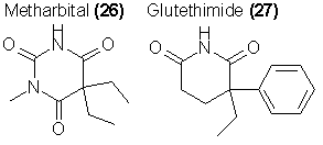 The inventive illegal chemist has several structural modifications available to him. The substitution of one of the N-H groups of 24 with an N-CH3 increases the potency of the drug some two to three times. An example is Metharbital (26), which is used more frequently as an anticonvulsant than as a sedative. If there are two N-methyl substitutions the resulting compounds are convulsants. The classification of either class of compounds as "Barbituric Acid Derivatives" would be extremely difficult to document legally, and it is a real possibility that such homologs would lie outside of the current narcotics laws.