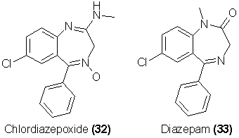 Another new and increasingly abused class of depressants are the benzodiazepines. Two of the most widely used prescriptional alternatives to the barbiturates or to meprobamate in anxiety and tension states are chlordiazepoxide [Librium, 32] and diazepam [Valium, 33].