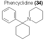 A difficult-to-classify family of drugs are those related to phencyclidine (34) as a parent substance. These materials are dissociative anaesthetics in their clinical application, but are widely abused due to the consistant visual synthesis experienced as a side reaction of their use. These compounds are probably best classified with the extremely fast-acting barbiturate anaesthetics in the pharmacologic sense.