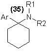 Although phencyclidine itself has been placed within Schedule III of the BNDD's listings of controlled substances, the original chemical literature describes the synthesis of a large number of closely related compounds77 and the associated patent literature gives quantitative data as to their potencies in humans78. In the last two years a number of these analogs have appeared on the illicit market, viz. the N-ethyl homolog [35, R1 = C2H5] and the thiophene analog [35, Ar = thiophenyl, R1, R2 = pentamethylene]. These latter two compounds are similar to phencyclidine in activity, both quantitatively and qualitatively, and are not included in any current drug listing. Of course these could be the harbingers of an open-ended number of varients, many of which could be predicted to maintain this form of biologic activity.