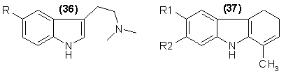Although the indoles are based orignially on plant sources, such as snuffs of the Caribbean area or intoxicants of South America, they are relatively easily available through synthesis. As such they may serve as representative paradigms of hallucinogenic exploration. The two parent structures may be considered N,N-dimethyltryptamine [DMT (36), R = H and Harmaline [37, R1 = H, R2 = OCH3]. These chemicals are alkaloids isolated from medicinal plants, but both have been extensively modified chemically.