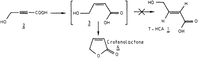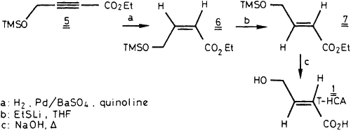 In an alternative route (Scheme 2), the O-TMS derivative 5 of 4-hydroxy- tetrolic acid was partially hydrogenated (Pd/BaSO4) to the Z-ester 6. Isomerization of 6 by lithium ethanethiolate16 gave 7 which hydrolysis provided E-4-hydroxycrotonic acid 1. Drastic anhydrous conditions were required for the isomerisation step and were critical at the mg scale. Tritiation experiments only gave side-products, however, probably Michael adducts16 of ethanethiol.