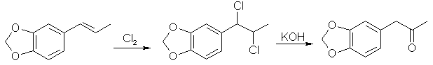 Boiling point 2 mmHg/108-12°C, 11 mmHg/154-6°C, 22mmHg/166-7°C (also reported 168°C @ 17 mmHg); Molecular weight 179 g/mole Piperonylacetone, a listed precursor, is used in some of the higher yielding and more common methods for MDMA and it's structurally similar compounds. Several methods are given in the chemical literature for preparation of piperonylacetone with varying yields and staring materials. Phenylacetone which is structurally closely related to piperonylacetone is prepared by these same methods and many others which could be applied to piperonylacetone's synthesis. Piperonylacetone from IsosafroleIsosafrole can be oxidized by peracids to it's diol derivative (or more specifically it's hydroxy formate in the case of performic acid--not depicted) and subsequently heated with sulfuric acid to form piperonylacetone in moderate yields.For in depth coverage of this reaction, see Organic Reactions, Epoxidation and Hydroxylation of Ethylenic Bonds with Organic Peracids. This reference also contains instructions for generating perbenzoic acid from benzaldehyde and air by photochemical means (real easy) (benzaldehyde is the major component of bitter almond oil). See Milas, Kurz, and Anzlow, The Photochemical Addition of Hydrogen Peroxide to Double Bonds. Journal of the American Chemical Society, vol. 59, pg 543, (1937) for another good reference. Performic Acid OxidationFugisawa and Deguchi[34] report on oxidizing isosafrole with performic acid by generating the performic acid in the reaction mixture.A solution 34g 30% H2O2 (hydrogen peroxide) and 150g of 80% HCO2H (formic acid) is stirred. To this is added dropwise 32.4g of isosafrole in 120ml of acetone. Add slowly enough to keep the temperature from rising above 40°C (about I hr). Continue stirring for 16 hrs while keeping the temperature below 40°C. Remove the solvent and formic acid with distillation under reduced pressure. A deep red residue will be left amounting to about 60g. Dissolve this residue in 60ml of methanol and 360g of 15% sulfuric acid. Heat on a water bath (boiling) for 3hrs in a reflux apparatus. Cool the solution and extract with 3x75ml portions of ether. Combine the ether extracts and wash first with water and then 5% sodium hydroxide. Remove the solvent in vacuum and distill the residue to yield approximately 20.6 g piperonylacetone (58% yield). Kojima, et. al., Japan. Kokia 74 100,044; Chemical Abstracts vol. 82, 72640z (1974), report a similar method as above, but they used somewhat higher concentrations of reactants (not as commonly available) and dichloroethane as solvent. The reported yield is 73%. Peracetic Acid OxidationHoffsommer[35] report on converting isosafrole to piperonylacetone by using peracetic acid in ethylacetate. The authors used prepared peracetic acid as opposed to generating it in situ. It can be generated, though, with acetic acid and hydrogen peroxide by using a slight excess of hydrogen peroxide over isosafrole and excess acetic acid as solvent. A second oxidation using pertrifluoroacetic acid is also given. No yield is given.Permanganate OxidationPotassium permanganate as a cold 2% solution in water (4258ml water + 86.9g KMnO4 (0.55moles)) will oxidize double bonds to a diol with the precipitation of manganese dioxide. This is commonly used as test for double bonds. Warm, slightly acidic, or concentrated solutions will cause further oxidation resulting in cleavage of the double bond. Add the above purple solution to 89.5g (0.5 moles) of isosafrole with stirring in an ice bath. As the reaction proceeds, manganese dioxide will precipitate as a brown-black solid and the purple permanganate color of the aqueous layer will gradually disappeared. When the color no longer lightens, stop stirring and pour off the excess aqueous layer. Filter the remaining aqueous and organic layers to remove the manganese dioxide and wash the precipitate with water. Extract the filtrate with ether (or toluene, benzene, etc). Remove the solvent in vacuum and treat the residue as in the performic oxidation above. (where it is dissolved in methanol and sulfuric acid). Alternative to beginning with a dilute solution of permanganate, a more concentrated solution could be added to the compound and a small amount of dilute solution. In this way, the permanganate is consumed as it is added so it remains diluted in the reaction flask.Piperonylacetone from Beta-nitroisosafroleThe nitrostyrene formed from the condensation of piperonal with nitroethane can be converted to the ketone, piperonyl acetone, by reaction with elemental iron in acetic acid[36].A stirred suspension of 32g iron fillings in 140 glacial acetic acid is gradually warmed on a steam bath. When quite hot but no white salts apparent, add dropwise a solution of beta-nitroisosafrole in 75ml acetic acid. (see MDA for the nitrostyrene, beta-nitroisosafrole, synthesis) Add the solution quickly enough to allow the reaction to proceed vigorously without excessive frothing. The orange color of the reaction mixture will turn reddish with white salts and a dark crust. The product will appear as a black oil on the sides of the flask. The mixture is added to 2L of water (use some of the water to wash the product free from the flask). This is then extracted with three 100ml portions of CH2Cl2 (methylene chloride). The extracts are combined and washed with several portions of 5% NaOH (sodium hydroxide). After removal of the methylene chloride under reduced pressure the residue is distilled under reduced pressure to yield approximately 8g of piperonylacetone. Piperonylacetone from the Dichloro Derivative of IsosafroleYuki[37] reports on piperonylacetone from 1-(3,4-methylenedioxyphenyl)dichloropropane and KOH.Chlorine and the other halogens react readily with double bonds (like the one of isosafrole's) to form dichloro compounds in solvents inert to the halogens. The most commonly used solvents are CH2Cl2 (methylene chloride), CHCl3 (chloroform), and CCl4 (carbon 