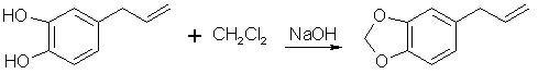 A mixture of 100ml methylene chloride and 500ml dimethylsulphoxide is stirred and heated to 125-130°C in a reflux setup on an oil bath. The top of the reflux condenser is fitted with a one hole stopper with a short glass tube in the hole. To the glass tube is connected rubber or vinyl tubing which is connected to a T. One end of the T is connected to cylinder of nitrogen with tubing and the other to a glass tube in a two holed stopper. The stopper is placed in a test tube containing oil (1/4 to 1/3 full). The other hole of the stopper is left open. This setup feeds a stream of nitrogen into the apparatus while allowing a pressure release through the test tube. If the nitrogen purchased is not dry it will need to be run through a flask containing calcium chloride. Lift the condenser up out of the flask to allow nitrogen to flush through the condenser. Allow the nitrogen to blow into the flask at the same time so it is flushed out too. Any leak in the apparatus will only allow nitrogen to escape as opposed to air and moisture entering. Add 7.55g 4-allyl-catechol and 4.15g sodium hydroxide simultaneously through the top of the condenser with a powder funnel. Repeat this addition every 5 min. (19 times) for a total of 151g (1 mole) 4-allyl catechol and 83g sodium hydroxide. After an additional 20 min. add 20ml methylene chloride and 3g sodium hydroxide. Continue stirring for 70 min. Alternate to adding the reagents in portions, the entire amount can be added at once with about a 10-15% decrease in yield. 4-allyl catechol is added in small amounts above to keep a low concentration of the dianion so that side reactions are minimized. Still add the additional methylene chloride and sodium hydroxide at the 1.5 hr mark. Steam distill the final solution in the same manner as safrole is steam distilled from root bark (using glassware setup). Separate the oil from the distillate water, dry with calcium chloride or sodium sulfate, and redistill under reduced pressure. Safrole from benzodioxole