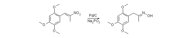 25,3 g (100mmol) 1-(2,4,5-trimethoxyphenyl)-2-nitropropene was suspended in 100ml IPA or EtOH and 800mg 5% Pd/C was wetted with IPA and added to the suspension. 39g (370mmol) sodium hypophosphite monohydrate was dissolved in 50ml warm water and added in portions to the nitroalkene suspension under violent stirring. The exotherm will easily bring this to a boil, but keep it at 40-50 deg C by immersion in a cold water bath. The reaction is finished when the top alcohol layer is colorless or has just a very slight yellow color left, this takes roughly two hours. Celite was added (three or so teaspoons) and the mixture is stirred for a minute and then filtered at the water pump. The filtrate quickly separates in two layers. The bottom aqueous layer was removed and the top layer was transferred to a rotovap, and the alcohol removed by distillation. This leaves a oil which quickly forms crystals which can either be dissolved in some DCM or toulene, filtered from a small amount of salts and stripped of solvent to give 23,4g (98%) 1-(2,4,5-trimethoxyphenyl)-2-propanone oxime, purity 98%. The oxime can then be further reduced to the amine (TMA-2), or the crude oxime can be hydrolysed to the ketone by acid hydrolysis. I have performed this reaction for about 6 months now. In the beginning I only got some 70% yield. But now, without having really changed anything, I get 97-98% everytime. Wierd! When using the nitropropenes from piperonal or benzaldehyde as substrates in the CTH method used to make 2,4,5-triMeOP-2-P oxime, the result is a little diffrent.