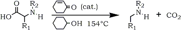 The reaction progress could easily be monitored by only checking the starting material to be dissolved. The solubility of the α-amino acid to cyclohexanol is an important factor affecting the rate of decarboxylation. For example, the decarboxylation usually completes within 5 h (Entries 7-12). However, in the case of L-histidine and L-threonine, these reactions require longer time (Entries 13-14).12 Further addition of 2-cyclohexen-1-one accelerates decarboxylation, but the isolated yield of the corresponding amine is decreased.