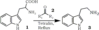 The procedure involved the heating of tryptophan (1) in a relatively small amount of tetralin with catalytic amount of carbonyl compounds (2) as shown in the table until the evolution of carbon dioxide was ceased. Tryptamine (3) thus formed was cleanly distilled from the reaction mixture and a single crystallization yielded a pure product in good yield.