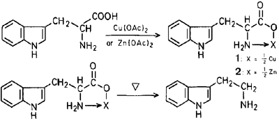 To a solution of L-tryptophan (50g) in water was added a solution of an excess of copper(II)acetate in water. The resultant precipitate was filtered. The extract was then washed several times with hot water to give the copper chelate compound. Yield: 52g, mp >280°C.