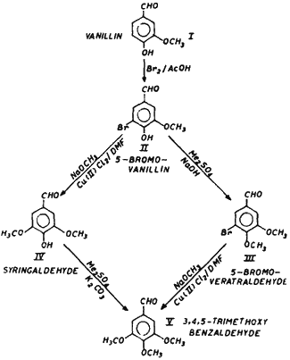 Vanillin (I) was brominated in glacial acetic acid with bromine to give 5-bromovanillin (II). A portion of II was methylated to 4-hydroxy-3,5-dimethoxybenzaldehyde (III) with dimethyl sulphate and sodium hydroxide. The bromo compounds II and III were subjected to alkoxylation using methanolic sodium methoxide in the presence of cupric chloride and dimethylformamide to give 4-hydroxy-3,5-dimethoxybenzaldehyde (IV) and V, respectively. The reaction was conducted in a sealed glass ampule which was placed in an autoclave at 120°C. Compound IV on methylation with dimethyl sulphate and anhyd. K2CO3 gave V. It has been observed that alkoxylation of II was more facile than that of III. This may be attributed to the presence of a bulkier group at the ortho-position of III.