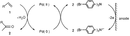 Electrooxidation methods were also employed for the direct oxidation of Pd(0) to Pd(II)3 or for generation of recyclable oxidents such as quinone4 or ferric chloride5as a co-oxidant for regeneration of Pd(II) catalyst. Usually divided cell systems have been utilized to avoid the deposition of palladium metal onto the cathode, which often led to unsatisfactory reaction conversion6. Herein, we report an improved procedure for the electrochemical Wacker type reaction by use of triarylamine as a recyclable mediator7 for regeneration of Pd(II) from Pd(0). The electrolysis can be achieved in both a divided or an undivided cells. In this double mediatory system, electrooxidation effects formation of triarylamine cation radical from triarylamine which regenerates palladium(II) species.