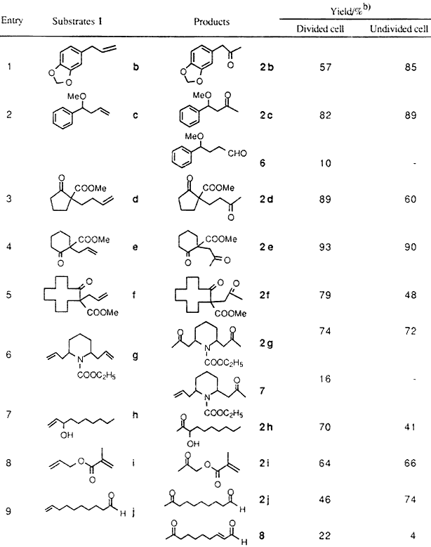 The combined use of PdCl2 or Pd(OAc)2 palladium chloride or palladium acetate with tri(4-bromophenyl)amine (3) was applied to the oxidation of a variety of terminal olefins and the results are shown in Table 2. The desired methyl ketones 2 are obtained in good yields when the starting olefins possess substituents such as a methoxy group (Entry 2), carbonyl functions (Entries 3-5) and an amino group (Entry 6) at the neighboring positions. A small ammount of by-products such as aldehyde (Entry 2) and dehydrated compound (Entry 9) are found. Up to 50 turnovers of the palladium catalyst could be achieved without noticeable loss of activity of the electrolysis system.