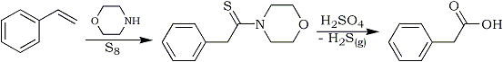 The Willgerodt-Kindler reaction with morpholine transforms acetophenones and styrenes to phenylacetic acids, through the intermediate phenylacetothiomorpholide, which is hydrolyzed in acid or basic solution to the desired acid.