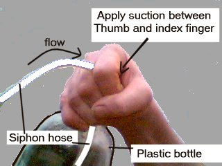 Siphoning can be very dangerous, using these volatile and caustic chemicals . This is a safer way to get the siphon started. If there are vapors in the plastic bottle, even this can be harmful if the vapors are inhaled. Hold neck of coke bottle in left hand, run aquarium tubing between index and middle fingers of left hand, and into bottle several inches. Place other end of tube in the fuel of coffee pot,. Hold coke bottle at a level lower than the coffee pot (for siphoning) one hard suck between finger and thumb of left hand to start siphon. Drain only the fuel into bottle, no emulsion should go in.