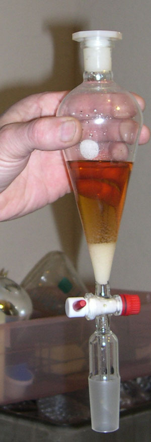 The methylamine is sitting in the bottom of the sep funnel so I guess it worked - looks white.  He said ethanol for the reaction or to dissolve it to get it out of the flask?  Don't ask about trying to dry ethanol around here or anything else for that matter.  Glasses fog just walking outside.