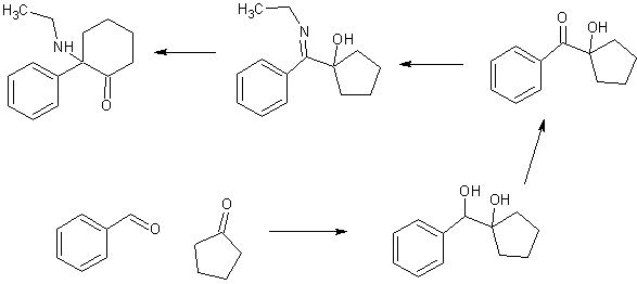 Another potential "fromcrap" route to ketamine could be base-catalysed o-nitrotoluene aldol condensation with cyclopentanone (like in US4497966, non-enolizable carbonyl compounds are preferred, but enolizable can also be used as they wrote "acetaldehyde" there