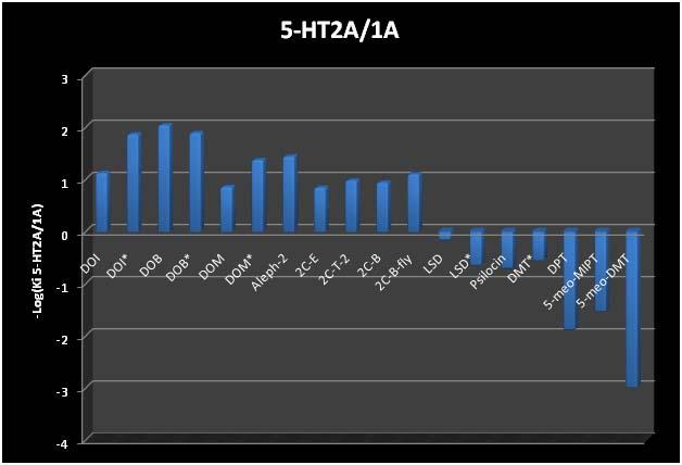 I had totally forgoten that the book "Psychedelic Information Theory" by James Kent has a chapter on "Psychedelic Receptor Binding". He saids that the substances that have the most Hallucinogenic potency have very high 5-HT2A affinity as well as 5-HT2C affinity...