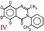 Methaqualone-d4 (IV) was prepared from phthalimide-d4. Anthranilic-d4 acid was prepared by the Hofmann reaction of phthalimide-d4 and was then converted to N-acetylanthranilic-d4 acid which was condensed with o-toluidine to form methaqualone-d4.
