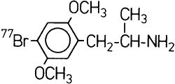 Labelling of the drug with bromine-77 is motivated by two reasons. It has been observed that substitution of hydrogen in the 4-position of 2,5-dimetoxyphenylisopropylamine (DPIA) by a methoxy group (TMA-2) or a methyl group (STP) causes an enhancement of central activity by a factor of 2 and 10, respectively4. Substitution of the methyl group by the isosteric bromine intensifies the psychotomimetic activity by a factor of hundred which means that it is 400 times more active than mescaline1. The high activity is explained by the structural relation to 6-hydroxydopamine and the hindered metabolic attack at the 4-position. Secondly, maximum accumulation in the brain occurs 3 to 6 hours after application; thus among the potentially useful neutron deficient halogen isotopes the longer lived 77Br (T½ 56 h) is preferable. But also the shorter lived positron emitter 75Br (T½ 98 min) might still be useful for positron emission tomography5.