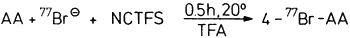 0.5 ml of TFA containing 5 to 10 mg of the amine (DPIA) was given to a 2 ml reaction vessel with carrier-free, dry 77Br-bromide and 2 mg NCTFS, weighed in a dry-box. The bromination reaction was allowed to take place in darkness at room temperature and gave rise to the 4-77Br-acetamide compound (4-77Br-AA) (Eq. II).
