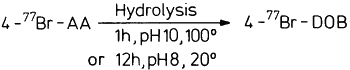 After one hour the TFA was evaporated. The residue was dissolved in aqueous NaOH solution at pH 10 and warmed for 1 hour (or milder at pH 8 at room temperature for 12 hours) in order to hydrolyze the acetamide (Eq. III). The liberated 77Br-amine was extracted with CCl4 (3x0.5 ml), isolated by evaporation of the solvent and redissolved in methanol. The resulting 77Br-4-bromo-amphetamine was separated by HPLC (see above). The whole labelling procedure took less than 2 hours and exclusively lead to the para product. The overall radiochemical yield of 4-77Br-DOB was 25% after chromatographic separation.