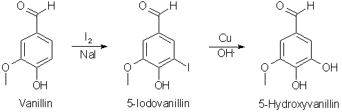 Vanillin can be iodinated in an aqueous solution of sodium triiodide (NaI3·NaI), made in situ from sodium iodide and iodine, forming 5-iodovanillin. Refluxing 5-iodovanillin in a strong sodium hydroxide solution produces 5-hydroxyvanillin, which is a useful precursor for 3,4,5-trimethoxybenzaldehyde (used in the synthesis of mescaline) as well as 3-methoxy-4,5-methylenedioxybenzaldehyde (myristicinaldehyde, used in the synthesis of MMDA-2). 5-Iodovanillin can also be treated with sodium methoxide to form syringaldehyde (4-hydroxy-3,5-dimethoxybenzaldehyde, used in the synthesis of escaline, proscaline and other mescaline derivatives. The procedure below also details the recovery of iodine from the spent mother liquor. The yield of 5-iodovanillin is essentially quantitative, and that of 5-hydroxyvanillin is 80-85%, the remainder being vanillin.