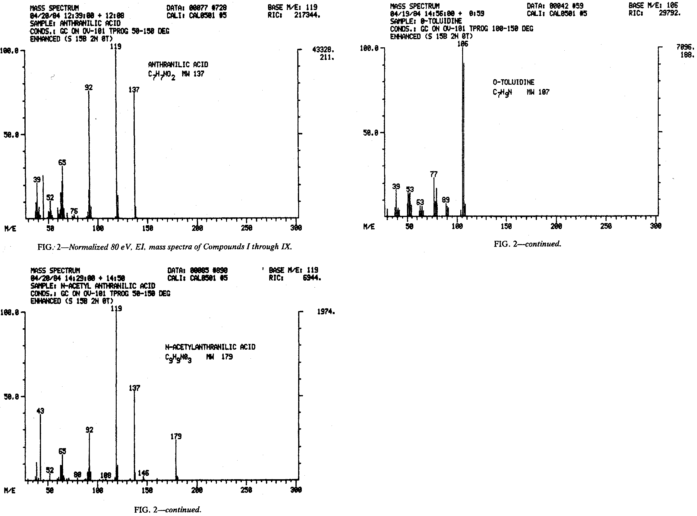A Finnigan Model 4530 Quadropole gas chromatograph-mass spectrometer (GC/MS/DS) was used to obtain the mass spectra. The chromatographic system used, was 1.8-m (6-ft) 2-mm ID glass column of 0.5% OV-101 on Gas Chrom Q, with a temperature program from 100 to 280°C at a rate of 20°C per minute, (Fig. 2).