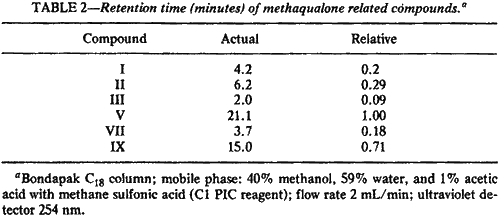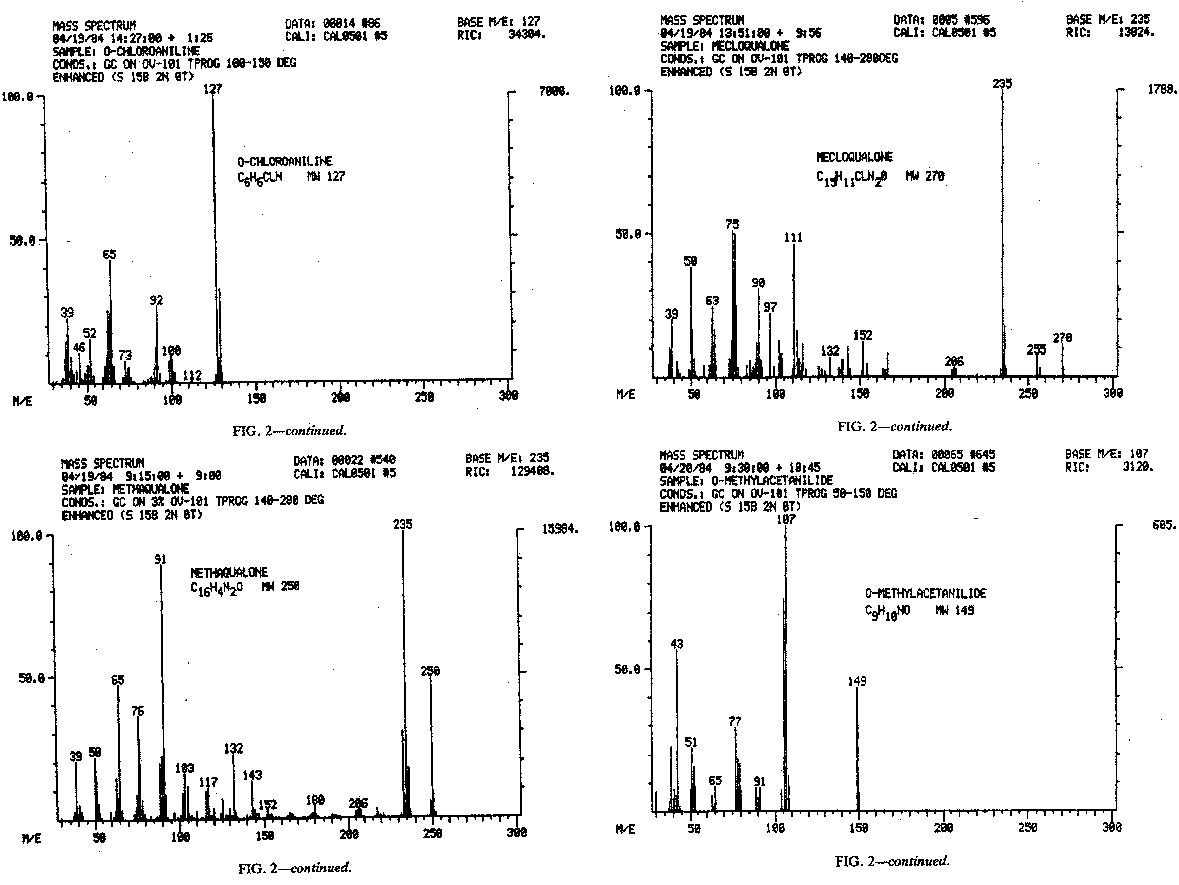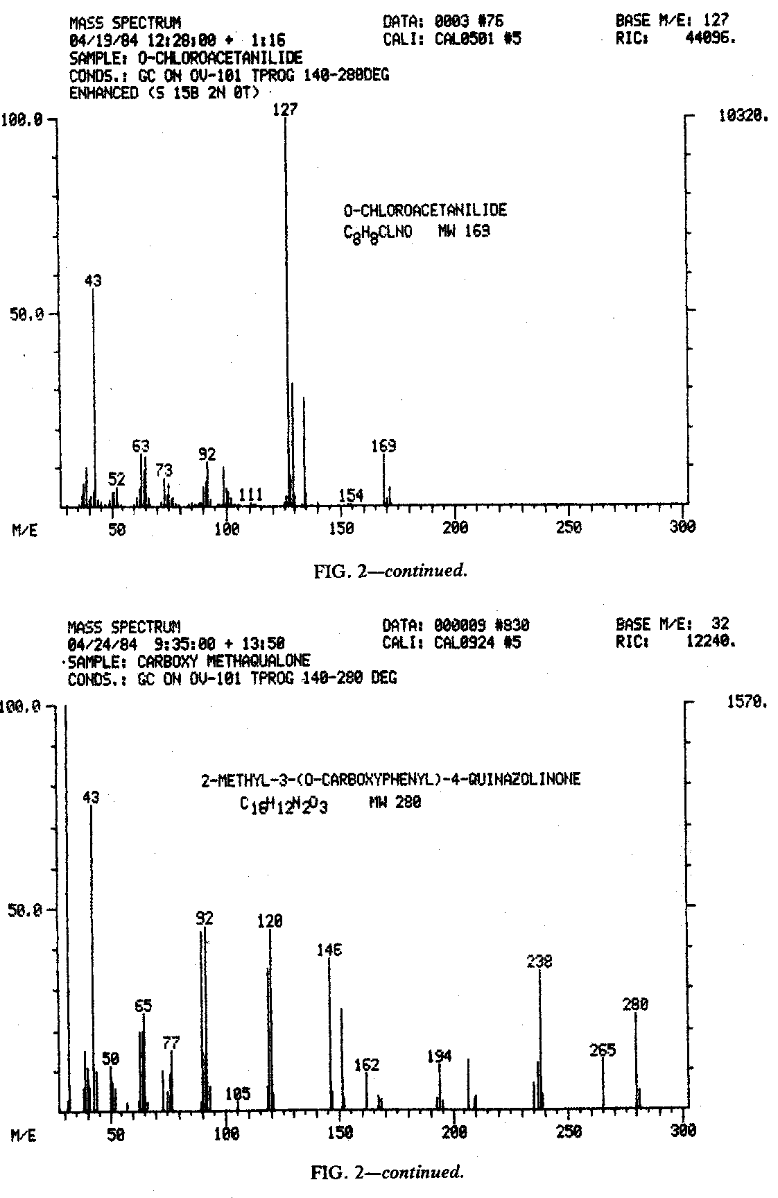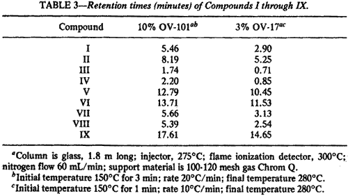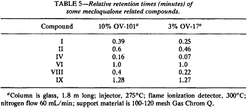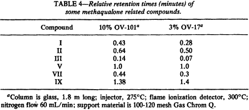 Gas-liquid chromatography was performed on a Hewlett-Packard 5840A equipped with 1.8-m (6-ft) 4-mm ID glass columns packed with 10% OV-101 and 3% OV-17 both on Gas Chrom Q. For the 10% OV-101 column, the initial temperature of 150°C is maintained for 3 min and then programmed to increase at a rate of 20°C per minute until a temperature 280°C is reached. For the 3% OV-17 column, the initial temperature of 150°C is maintained for 1 min, and then programmed to increase at a rate of 10°C per minute until a temperature of 280°C is reached. These somewhat complex programs allow for the elution of both reactants and by-products. Table 3 gives the actual retention times of the compounds, while Table 4 and Table 5 give the relative retention times for the compounds related to methaqualone and mecloqualone, respectively.