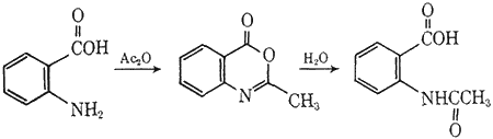 In the experiment, anthranilic acid is converted to 2-methylbenzisoxazinone by the action of acetic anhydride. This compound may be isolated (a good exercise in that the benzisoxazinone is readily hydrolyzed by atmospheric moisture2) or converted directly to N-acetylanthranilic acid by a mild hydrolytic reaction.