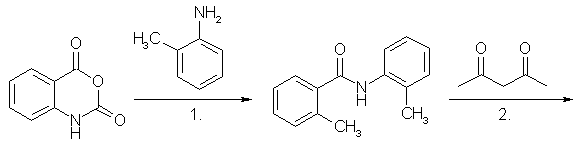 This method is similar to the one used by Klosa, but this one drives out the water byproduct from the reaction mixture with heat, instead of letting polyphosphoric acid bind it. This method also manages to push the yield a little further. The product formed in the first step is N-acetylanthranilic acid, which can be made as described in the precursors section below. If so, begin with the addition of o-Toluidine to the already made N-acetylanthranilic acid.