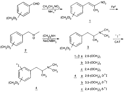 The syntheses of 122I- and 125I-labelled 2,4-dimethoxy-N,N-dimethyl-5-iodophenyl- isopropylamine, 3,5-dimethoxy-N,N-dimethyl-2-iodophenylisopropylamine and 2,6-dimethoxy- N,N-dimethyl-3-iodophenylisopropylamine are described. The speed (3 min, including purification) and yield (45-85%) obtained in direct iodination procedures utilizing chloramine-T have allowed the use of the short-lived positron emitter 122I (t½ = 3.6 min) in brain blood flow imaging studies. The three appropriate precursors (the meta-dimethoxy-N,N-dimethylphenylisopropylamines) were prepared from the corresponding phenylacetone analogues by reductive amination employing dimethylamine and NaCNBH3. The ketones were obtained from the appropriate nitrostyrenes through reduction with elemental Fe.