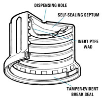 The self-sealing septum allows the solvent to be dispensed by syringe at the point of use but because the cap itself is screw-on it may also be opened conventionally. However, it is important to note that once in contact with the atmosphere product quality can deteriorate depending on the hygroscopic nature of the solvent.