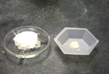 (hexagonal weigh boat), a powdery white substance, and the final crystals