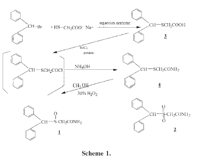 One aspect of our preparation of moda?nil needs further mention. When diphenylmethylthioacetamide (4) is being oxidized by H2O2, care must be taken to keep the reaction mixture cool, and workup should be done in a timely manner. Allowing the reaction to go to 24 h or longer at room temperature results in the formation of the sulfone (2). The paper by Mu et al. (3) does not discuss this possibility. In our hands, the procedure stated therein led to the higher melting sulfone and not the moda?nil. Our NMR data for the newly prepared moda?nil preparation are in consonance with the data of the patented commercial product. It should be noted that the methylene protons in moda?nil are geminally